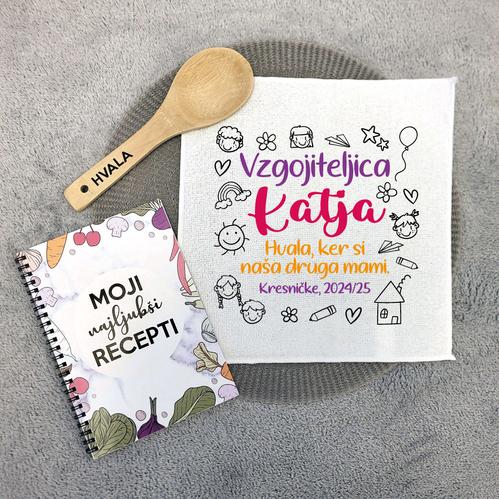 Komplet personalizirane krpe, kuharskega zvezka in kuhalnice je čudovito darilo.