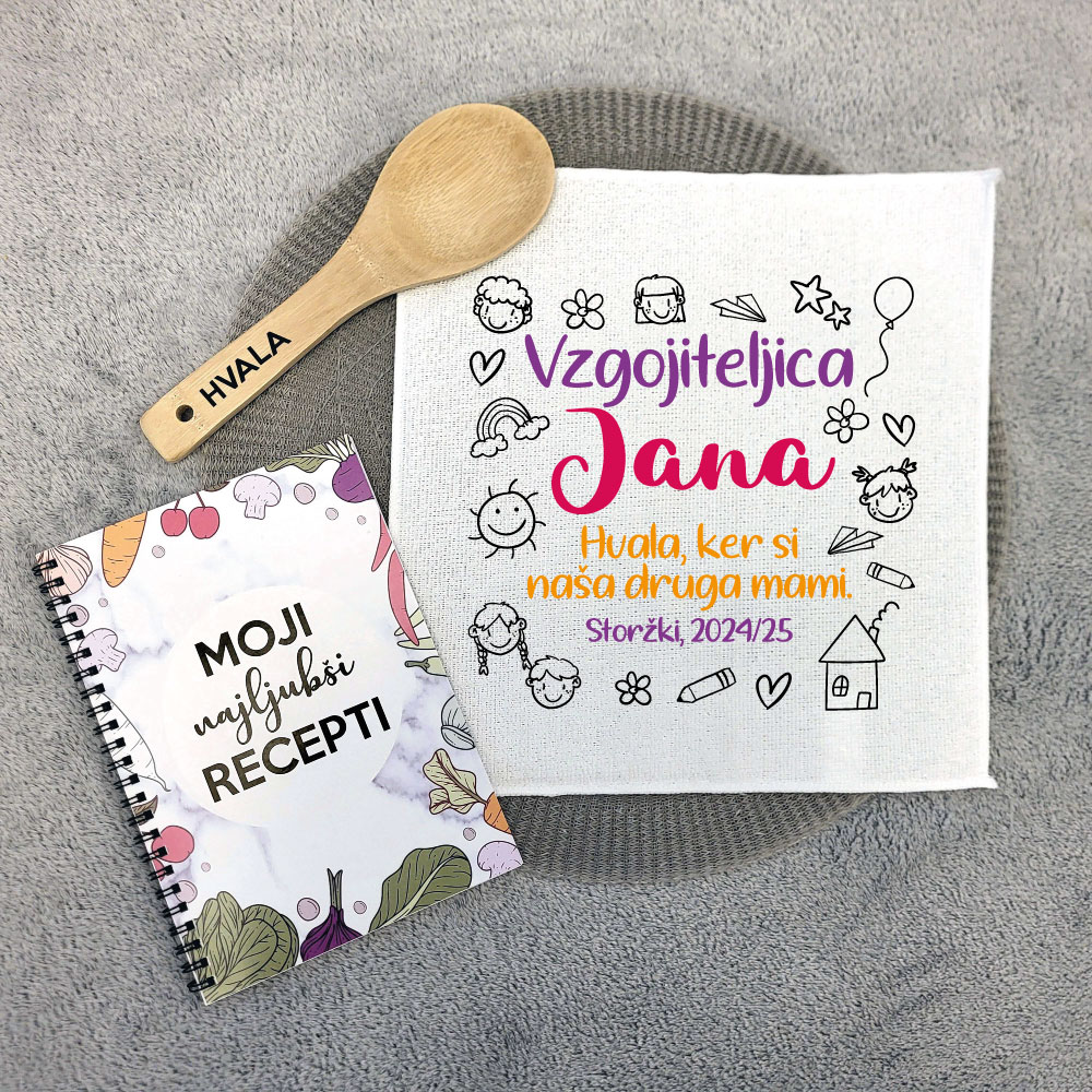 V kompletu dobiš tudi personalizirano kuhinjsko krpo in leseno kuhalnico.
