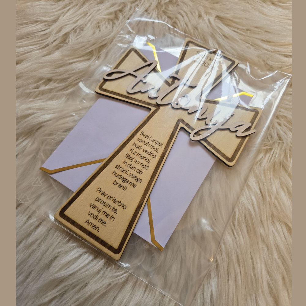 V kompletu prejmeš: križ, kuverto, voščilnico in celofan vrečko.