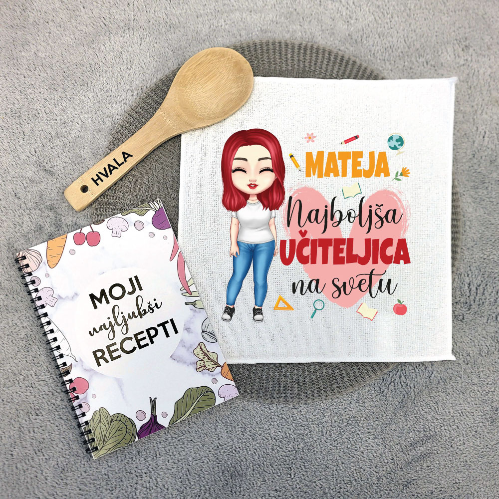 V kompletu dobiš tudi personalizirano kuhinjsko krpo in leseno kuhalnico.