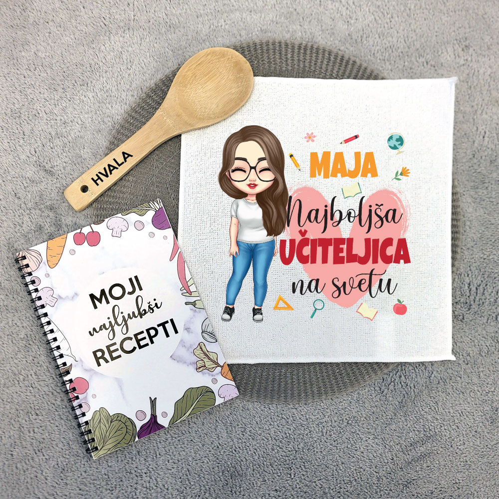 Komplet personalizirane krpe, kuharskega zvezka in kuhalnice je čudovito darilo.