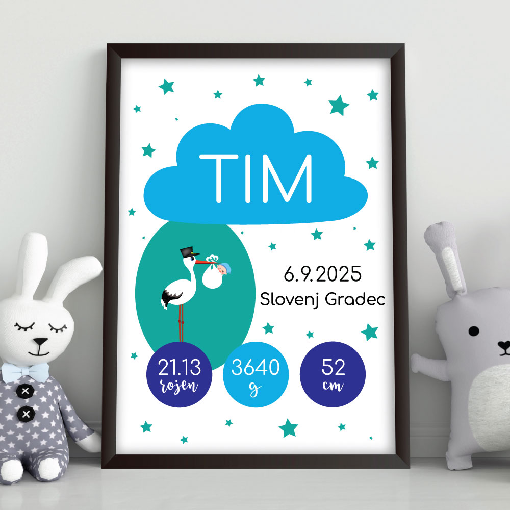 Personaliziran okvir s podatki otroka – modra štorklja