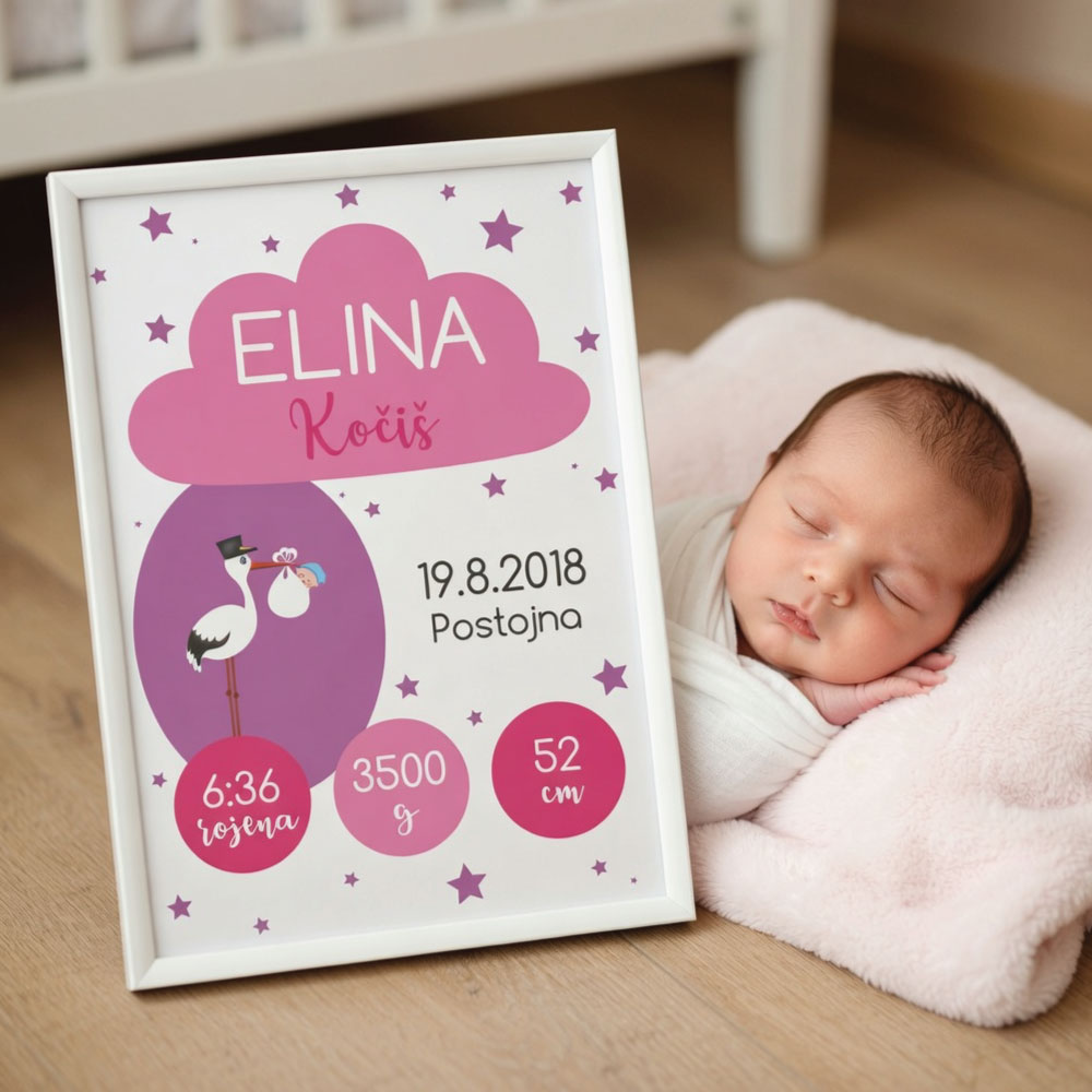 Personaliziran okvir s podatki otroka ob rojstvu je elegantno, osebno in globoko čustveno darilo.