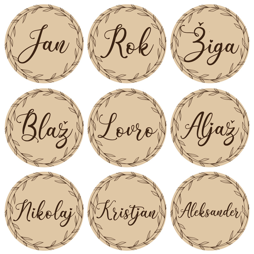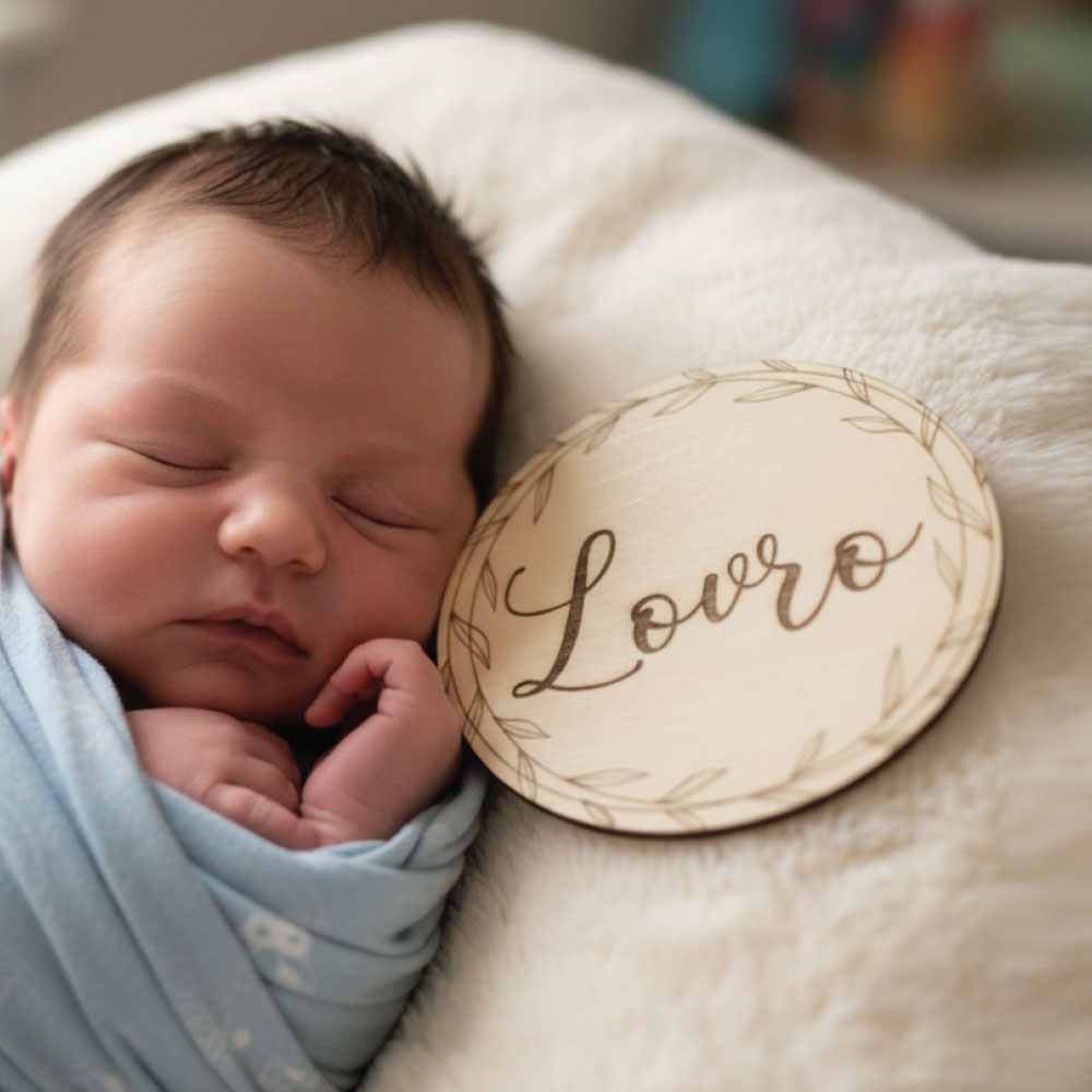 Lesena oznanitvena ploščica v okrogli obliki je popoln dodatek za prvo fotografiranje dojenčka ter nepozaben spominek za vso družino.