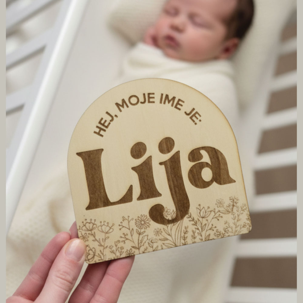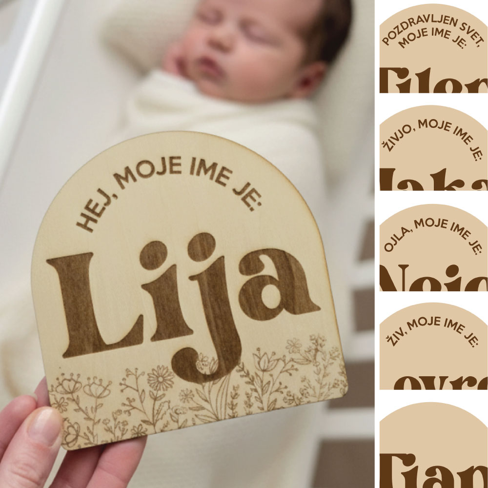 Lesena oznanitvena kartica v polkrožni obliki je popoln dodatek za prvo fotografiranje dojenčka ter nepozaben spominek za vso družino.