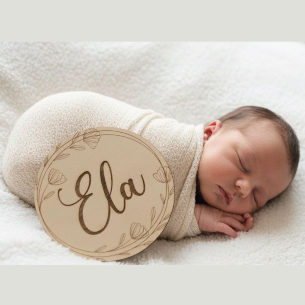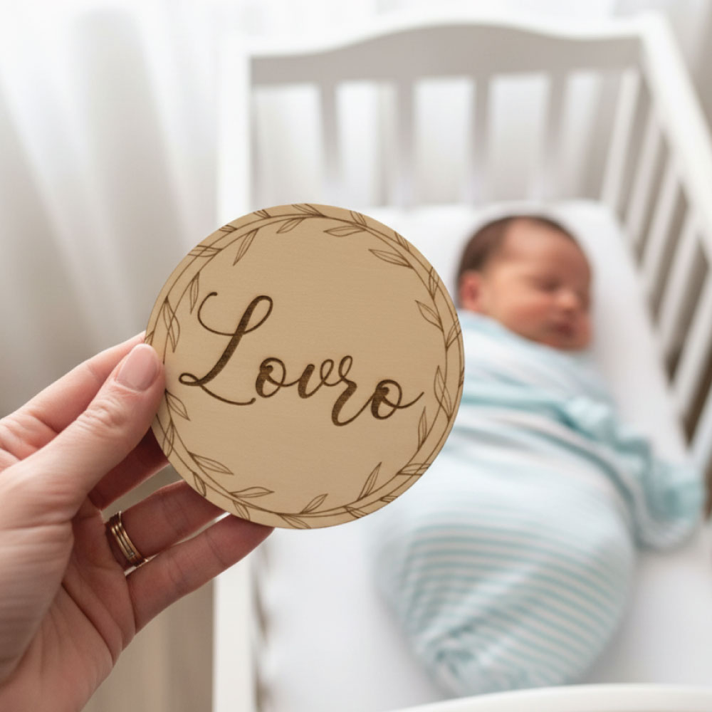 Lesena oznanitvena ploščica v okrogli obliki je popoln dodatek za prvo fotografiranje dojenčka ter nepozaben spominek za vso družino.