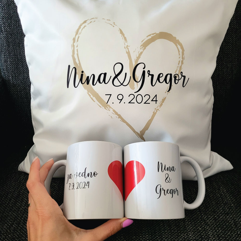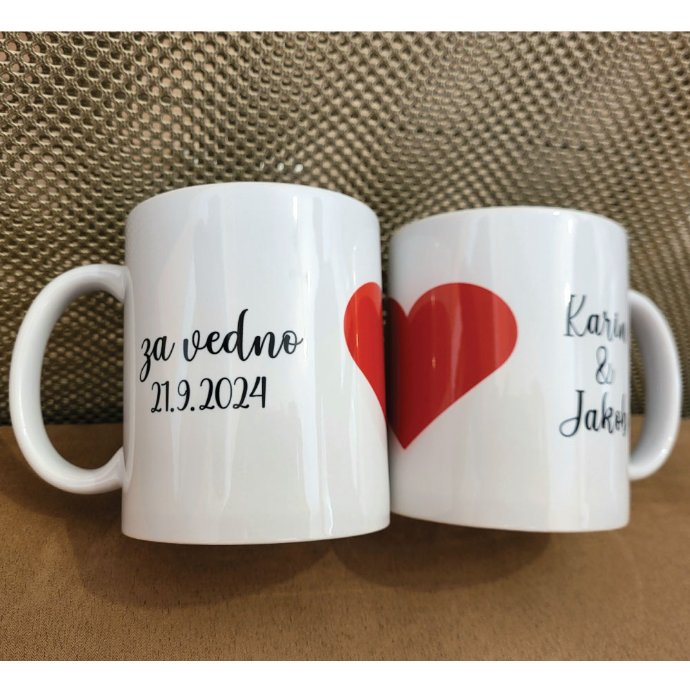 Skodelica je potiskana okrog in okrog. Na sprednji strani sta imeni para, na sredini je srček, na zadnji strani pa napis za vedno in datum.