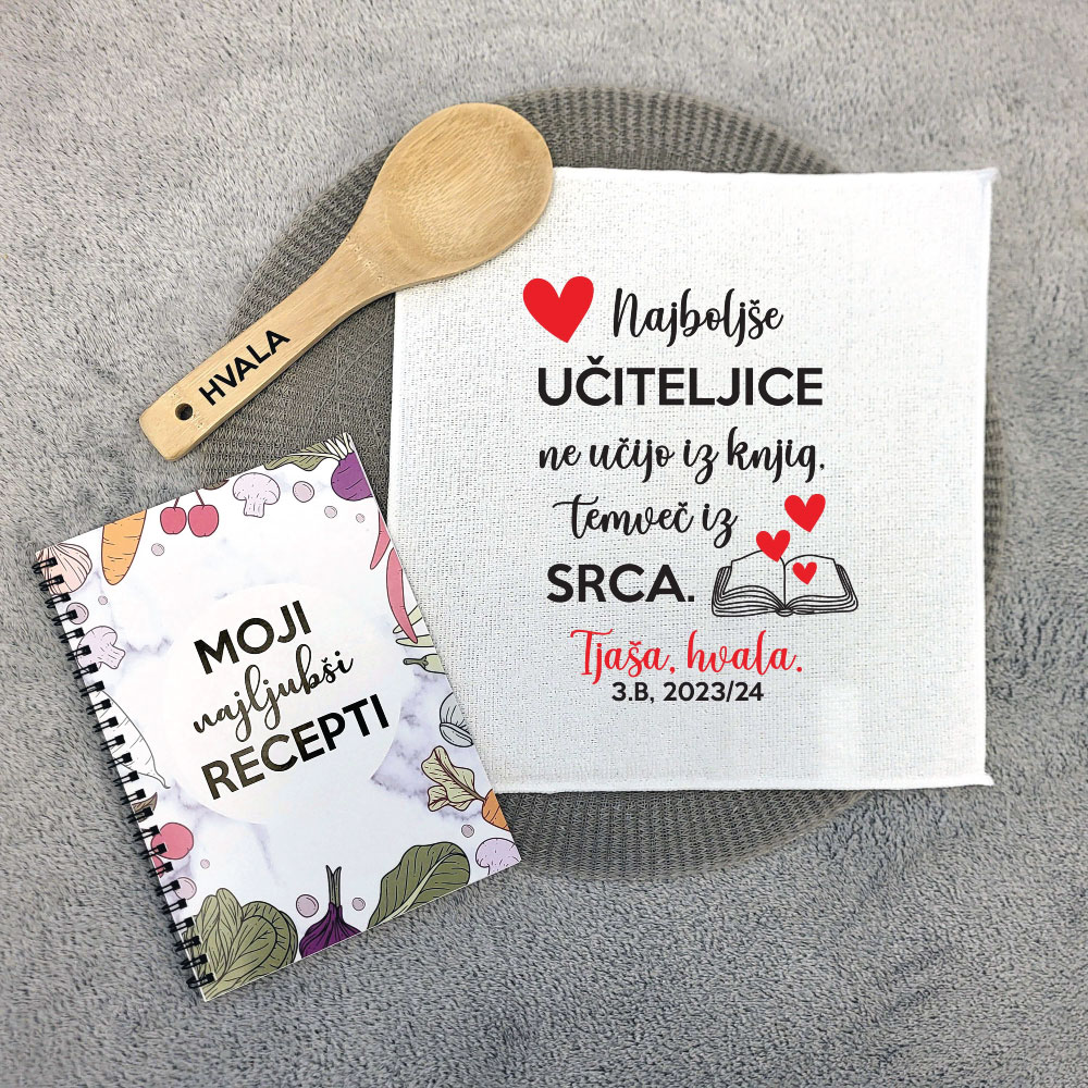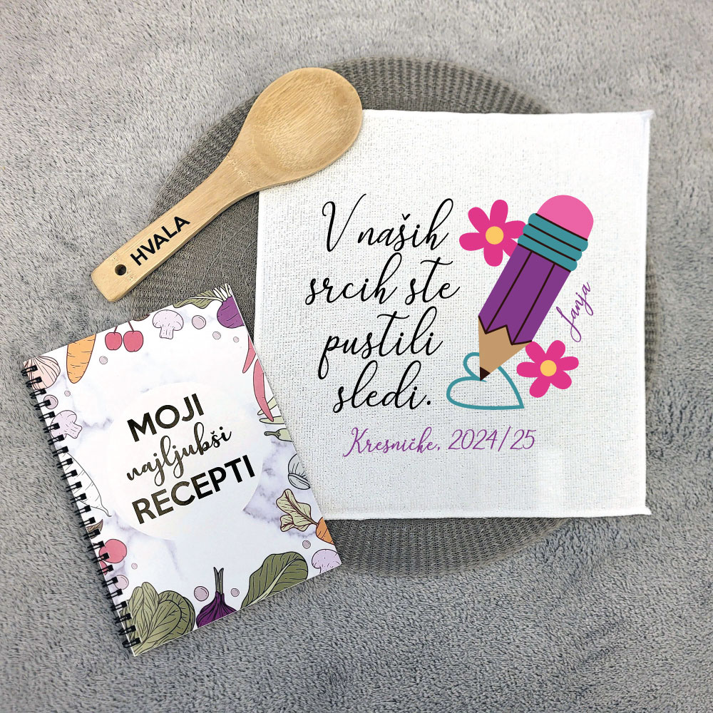 V kompletu dobiš tudi personalizirano kuhinjsko krpo in leseno kuhalnico.